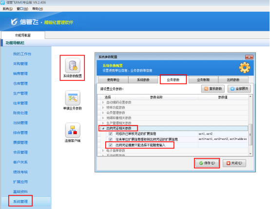 ????在功能導航窗點擊“系統管理”→“系統參數設置”→“業務參數”可以進入到“業務參數”配置界面,在業務單據相關參數內打勾啟用“可修改已審核憑證的擴展信息”參數,并設置參數值(擴展信息字段名),默認為“ext1,ext2(擴展信息1,擴展信息2)”,如下圖所示: