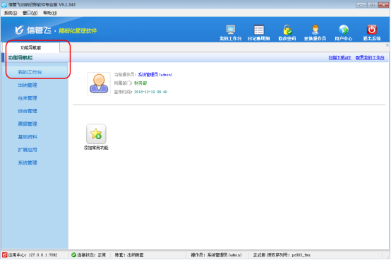 ????信管飛出納記賬軟件是一款針對各類企事業單位財務出納記賬開發的,集現金日記賬記賬與點驗、銀行日記賬記賬與核帳、應收應付往來賬管理、票據管理(支票管理、承兌匯票管理)、發票管理、工資管理、員工借款管理、費用報銷管理等為一體的出納管理軟件。