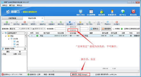 ????保存權限后,更換操作員,選擇操作員“王五”登錄軟件,新增一個現金日記賬,保存日記賬后,在現金日記賬列表中可以看到“審核憑證”按鈕為灰色,無法進行審核操作,如下圖2所示: