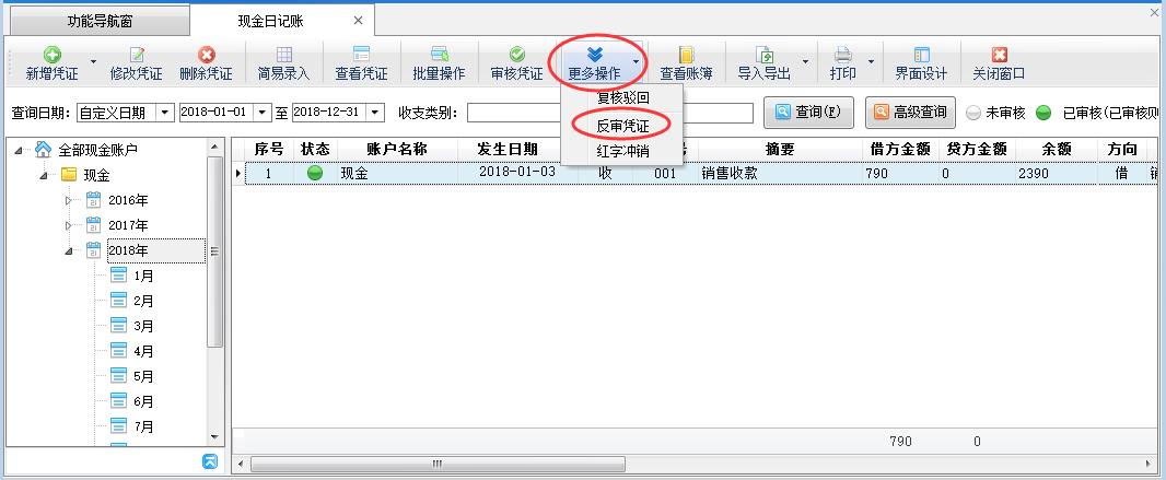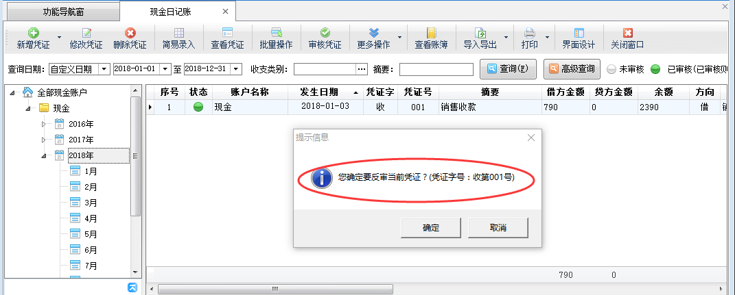 ????在現金日記賬列表界面,如圖2所示,點擊“更多操作”—》“反審憑證”,系統彈出提示信息“您確定要反審當前憑證?”,點擊“確定”按鈕,如圖3所示。