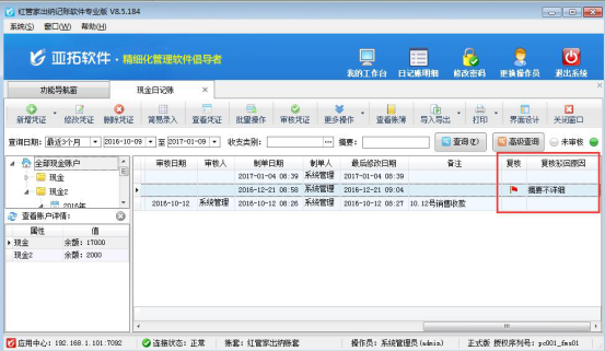 ????操作員“張亞”登錄軟件,在現金日記賬中找到剛才一審的現金日記賬,點擊“審核”,可看到“當前審核環節”變為“二審”如下圖所示:
