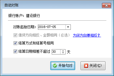 自動對賬:點擊工具欄中的“自動對賬”按鈕,系統會彈出“自動對賬”窗口,如圖2所示,設置對賬起始日期及對賬選項后點擊“開始勾對”即可。