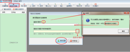 ????在紅管家出納記賬軟件中,進入附件管理窗口,點“高拍儀掃描”-》“高拍儀掃描參數配置”,配置高拍儀程序以及掃描文件存儲目錄,如下圖所示: