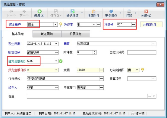 ????功能導航窗“往來管理”—》“應收款管理”中,新增一筆客戶“測試”的應收款記錄,應收金額5000元,保存并轉記現金憑證,如下圖所示: