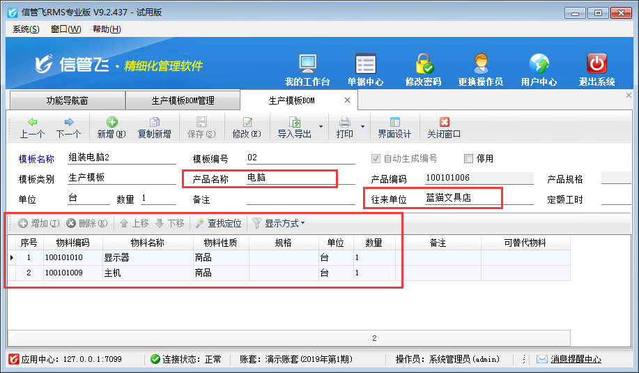 ????參數配置完成之后,打開生產管理模塊,重新新增生產模板BOM表時,即可選擇往來單位,如下圖所示,在給“亞拓公司測試”、“藍貓文具店”兩家客戶生產同樣的產品“電腦”時設置的不同的生產模板,所需的原材料不同。