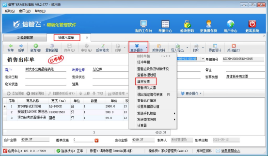 ????在功能導(dǎo)航窗選擇“銷售管理”—》“銷售出庫(kù)單”,保存審核單據(jù)后,點(diǎn)擊工具欄“更多操作”下的填開(kāi)發(fā)票,如下圖所示: