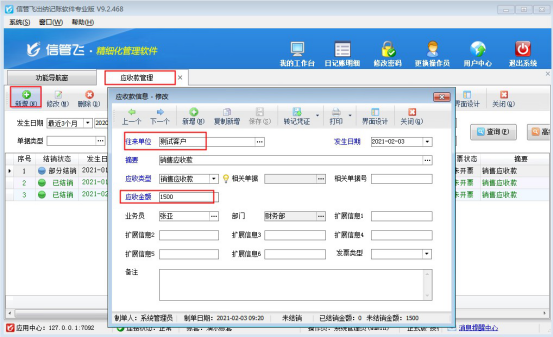 ????示范下銷項(xiàng)發(fā)票如何關(guān)聯(lián)應(yīng)收款記錄。首先先登記一筆應(yīng)收款,在功能導(dǎo)航窗點(diǎn)擊“往來(lái)管理”—》“應(yīng)收款管理”,點(diǎn)擊工具欄“新增”按鈕新增一筆應(yīng)收款記錄如下圖所示: