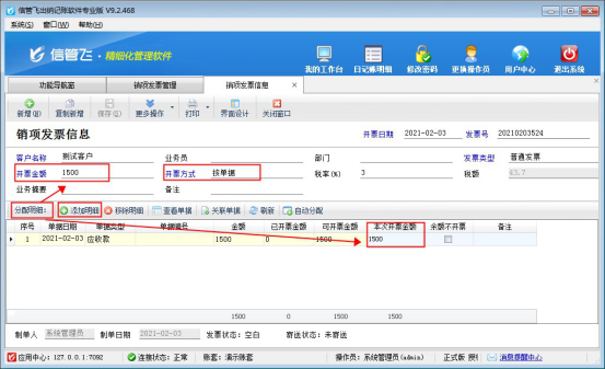 ????默認(rèn)新增的記錄是未開(kāi)票狀態(tài),返回功能導(dǎo)航窗,點(diǎn)擊“票據(jù)管理”—》“銷項(xiàng)發(fā)票管理”界面上點(diǎn)擊“新增發(fā)票”,在新增界面選擇客戶“測(cè)試客戶”,開(kāi)票方式選擇“按單據(jù)”,點(diǎn)擊“添加明細(xì)”按鈕,選擇界面發(fā)票類型選擇“全部”,勾選應(yīng)收款明細(xì)記錄。輸入開(kāi)票金額后點(diǎn)擊分配明細(xì),把開(kāi)票金額分配至“本次開(kāi)票金額”中,然后輸入發(fā)票號(hào)保存單據(jù),如下圖所示: