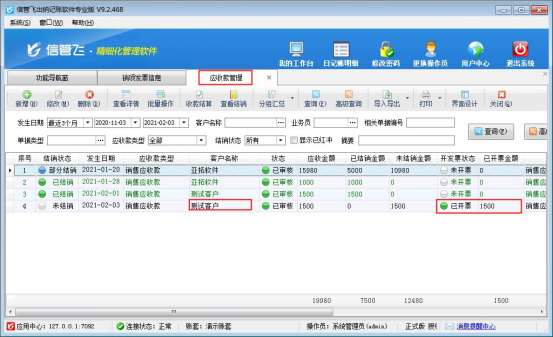 ????銷項(xiàng)發(fā)票信息保存后,返回至應(yīng)收款管理界面,可看到應(yīng)收款記錄對(duì)應(yīng)的開(kāi)票狀態(tài)變?yōu)椤耙验_(kāi)票”并顯示已開(kāi)票金額,如下圖所示: