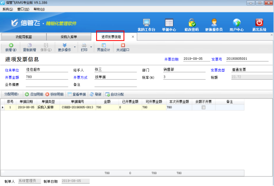 ????發(fā)票管理為擴(kuò)展模塊,只有信管飛RMS標(biāo)準(zhǔn)版和專業(yè)版支持附加使用。填開(kāi)發(fā)票除了在發(fā)票管理中直接進(jìn)行新增,軟件也支持在開(kāi)單界面直接填開(kāi)發(fā)票操作。本文以信管飛RMS專業(yè)版的采購(gòu)入庫(kù)單為例,講一下在采購(gòu)入庫(kù)單中如何快速填開(kāi)發(fā)票操作。