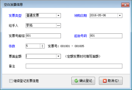 新增記錄:點(diǎn)擊“新增記錄”按鈕,進(jìn)入“空白發(fā)票信息”窗口,如圖2所示,其中“起始號(hào)碼”是必填項(xiàng),其他內(nèi)容根據(jù)自己的業(yè)務(wù)需要進(jìn)行填寫(xiě),最后點(diǎn)擊“確認(rèn)登記”即可。