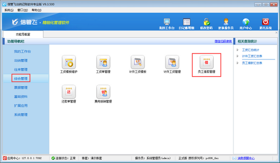 ????在功能導航窗點擊“綜合管理”—》“員工借款匯總表”即可進入員工借款匯總表界面,如下圖所示。