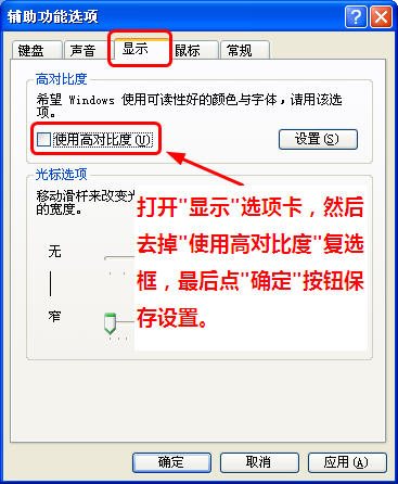 在“輔助功能選項(xiàng)”中,點(diǎn)“顯示”選項(xiàng)卡,去掉其中的“使用高對比度”復(fù)選框,最后點(diǎn)”確定“按鈕保存設(shè)置。重啟電腦,即可解決問題。