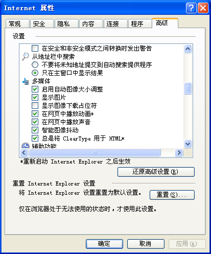 (1)設(shè)置在IE選型的高級標(biāo)簽頁,復(fù)選 顯示圖片,然后重啟瀏覽器。具體操作如下圖所示: