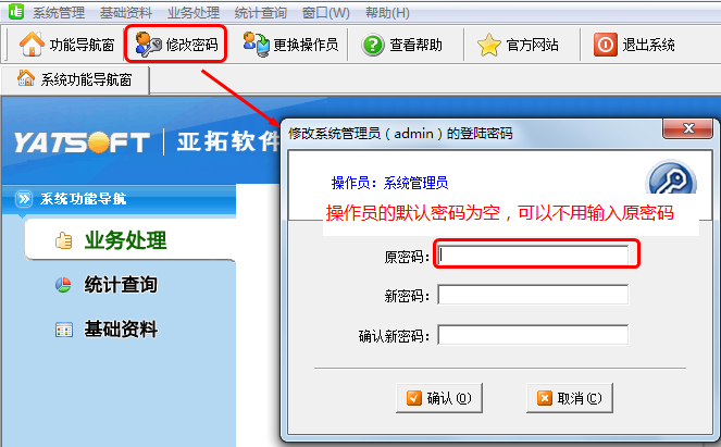 (2)如果操作員的當(dāng)前密碼為空(每個操作員的默認(rèn)都是沒有密碼的),可以不用輸入“原密碼”,直接輸入兩次新密碼,然后點(diǎn)“確認(rèn)”即可。