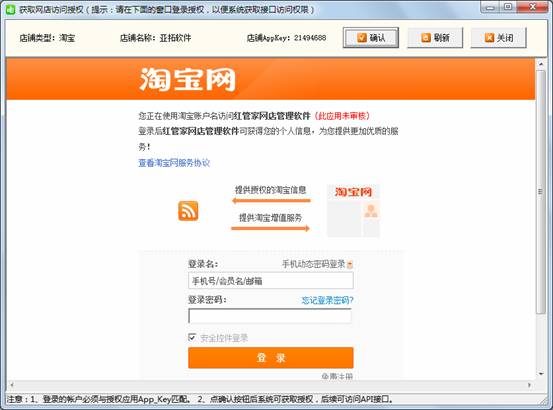 在“網店信息”窗口點擊 “獲取授權”按鈕進行測試,注意由于目前淘寶API的限制,淘寶3鉆以下店鋪申請的API的授權,24小時就會過期,屆時需要重新登錄一下(系統在授權失效時會彈出授權窗口,登錄一下即可)。