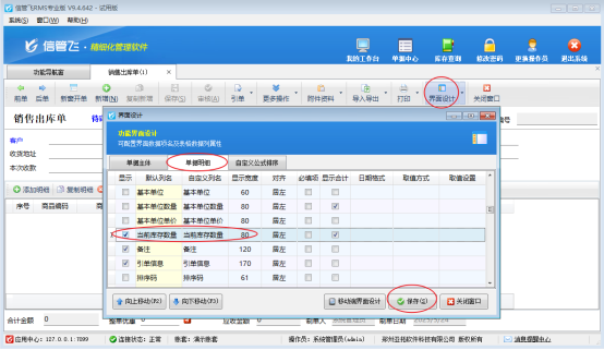 在功能導航欄點擊“銷售管理”---銷售出庫單,打開銷售出庫單界面,在該界面點擊“界面設計”按鈕,在單據(jù)明細項勾選參數(shù)“當前庫存數(shù)量”,點擊保存按鈕,關(guān)閉銷售出庫單界面重新打開,即可刷新商品當前庫存。