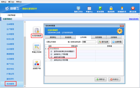 登錄自動提示預(yù)警,需要設(shè)置下參數(shù)。功能導(dǎo)航窗點擊“系統(tǒng)管理”,打開“系統(tǒng)參數(shù)配置”,業(yè)務(wù)參數(shù)中啟用以下參數(shù):“登錄系統(tǒng)時彈出系統(tǒng)預(yù)警窗口”、“啟用庫存上下限預(yù)警”、“啟用負庫存預(yù)警”。如下圖所示: