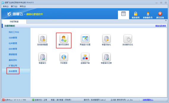 系統管理員賬號登錄軟件,在功能導航窗點擊“系統管理”—》“操作員及授權”,進入“操作員管理及授權”界面,選擇操作員賬號“張亞”,在其右側的功能模塊權限內選擇“票據管理”模塊,將進/銷項發票管理的“新增”權限勾選取消,然后保存權限設置,如下圖所示。