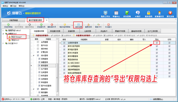 在功能導(dǎo)航窗點(diǎn)擊“系統(tǒng)管理”—》“操作員及授權(quán)”打開(kāi)操作員管理及授權(quán)界面,選擇操作員賬號(hào)“張亞”,然后在其右側(cè)的功能模塊權(quán)限內(nèi)選擇“庫(kù)存查詢(xún)”,將倉(cāng)庫(kù)庫(kù)存查詢(xún)的“導(dǎo)出”權(quán)限勾選上,然后保存權(quán)限設(shè)置,如下圖所示。