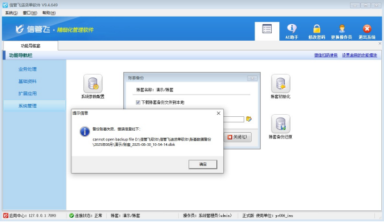 信管飛倉庫管理軟件、信管飛出納記賬軟件、信管飛送貨單軟件、信管飛RMS等本地版軟件賬套數(shù)據(jù)默認(rèn)存儲(chǔ)在軟件安裝目錄下,支持對賬套數(shù)據(jù)進(jìn)行備份,如需要更換主機(jī)電腦,需要在原來的主機(jī)電腦上備份賬套數(shù)據(jù),將生成的備份文件復(fù)制到新的主機(jī)電腦上,然后在新的主機(jī)電腦上安裝軟件,使用備份文件還原數(shù)據(jù)即可。用戶在備份賬套時(shí)遇到備份失敗的情況,該如何處理?