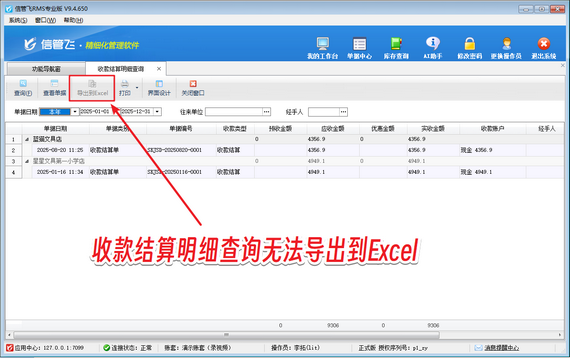 出現(xiàn)以上問題的原因是:操作員賬號沒有收款結(jié)算明細查詢的導出Excel權(quán)限。