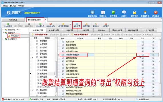 解決方法如下:在功能導航窗點擊“系統(tǒng)管理”—》“操作員及授權(quán)”打開操作員管理及授權(quán)界面,選擇操作員賬號“李拓”,然后在其右側(cè)的功能模塊權(quán)限內(nèi)選擇“往來查詢”,將收款結(jié)算明細查詢的“導出”權(quán)限勾選上,然后保存權(quán)限設置,如下圖所示。