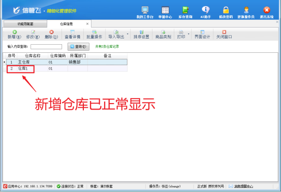 設置操作員權限后,使用操作員“張亞”重新登錄軟件,此時新增倉庫已正常顯示。